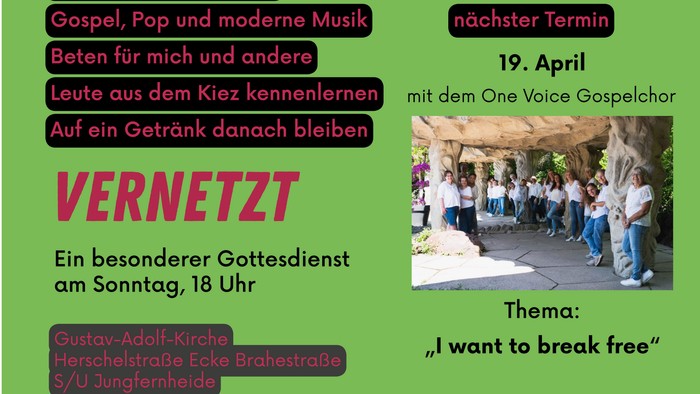 An diesem Sonntag feiern wir einen Abendgottesdienst mit etwas anderem Ablauf, einen Oberthema, der Möglichkeit zum Austausch und mit lebendiger Musik. Es singt der ONE VOICE GOSPEL CHOIR. (https://www.onevoicegospelchoi...)