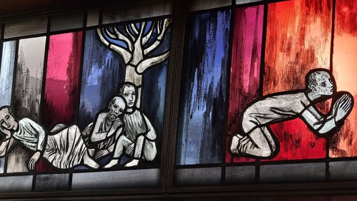 Pilatus war es, der im Prozess gegen Jesus über den Angeklagten sagte: „Seht den Menschen!“ Das hat ihn nicht davon abgehalten, Jesus zum Tod zu verurteilen. In der Passionszeit werden wir von den Erzählungen der Evangelien immer wieder nachdrücklich dazu aufgefordert, den Menschen zu sehen, uns Menschen mit all unseren Licht- und Schattenseiten, aber eben auch den Menschen, der seine dunkelsten Stunden erlebt und erleidet. Auf dem Glasfenster des Stuttgarter Künstlers Wolf Dieter Kohler sehen Sie, wie menschlich es in der Passionsgeschichte zugeht: Rechts der inbrünstig betende Jesus, links die drei schlafenden Jünger im Garten Gethsemane. Besonders am Gründonnerstag und am Karfreitag sind wir dazu eingeladen, uns in diese Geschichten zu vertiefen.